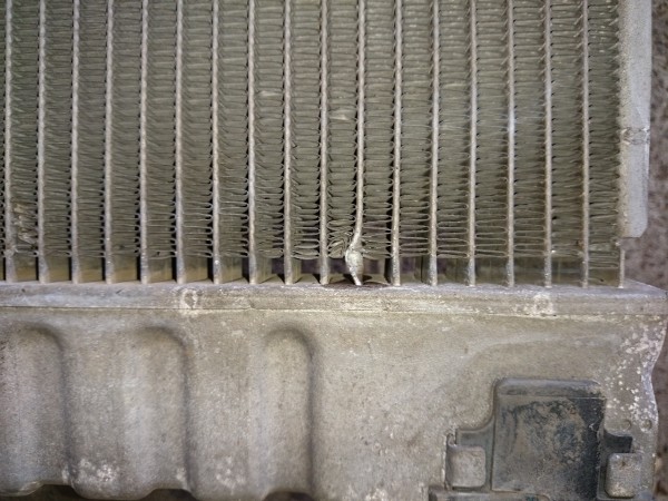 原因は水漏れでサブラジエーター部分にぶつけた跡が・・・